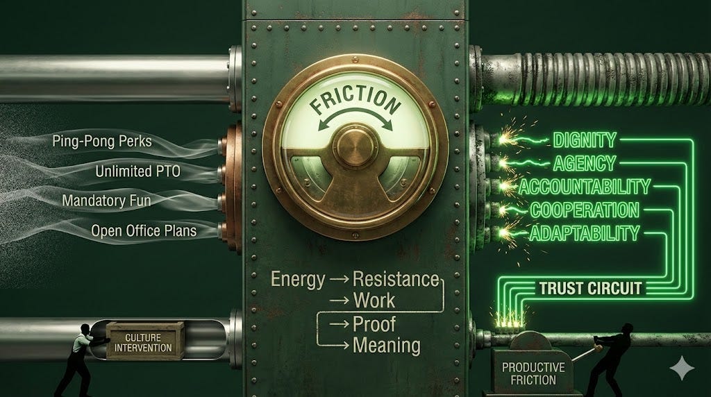 Why every corporate “happiness fix” fails: the Law of Friction and Meaning explains why removing resistance destroys trust, and why only engineered friction creates it.