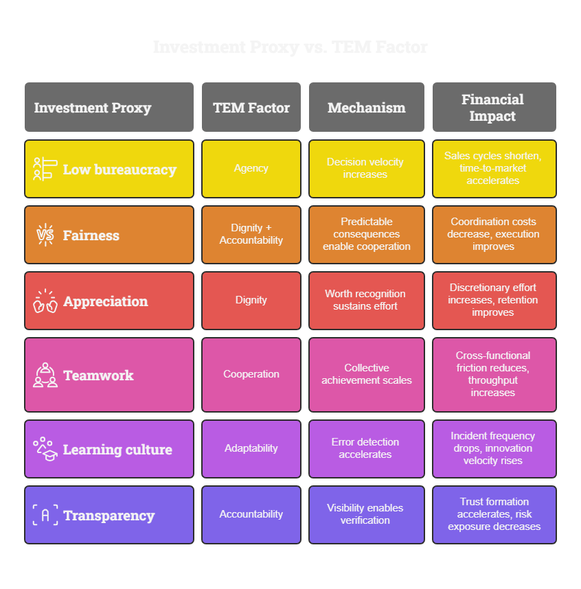 Not because kindness is profitable. Because TEM architecture converts to financial performance through measurable mechanisms.