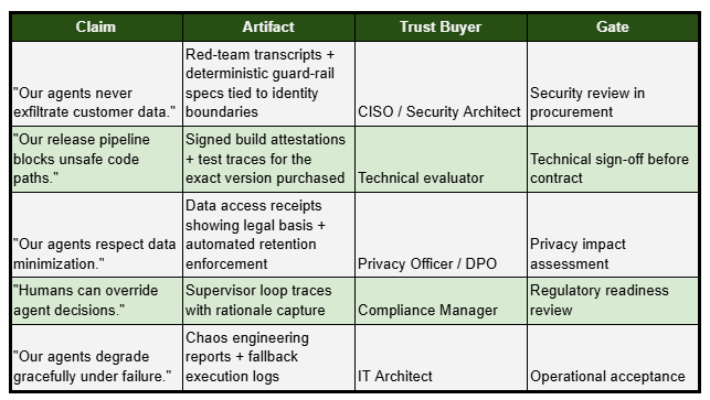 Proxies are the floor, not the ceiling. They keep you out of court. They do not help you win a seven-figure renewal when the buyer’s board is spooked by “agentic” headlines. The first company in your market segment to publish continuous, buyer-grade proof—build attestations by version, model cards a procurement team can read, red-team summaries with fixes merged, real-time access logs scoped to customer data—will command pricing power that proxy-dependent competitors cannot match.