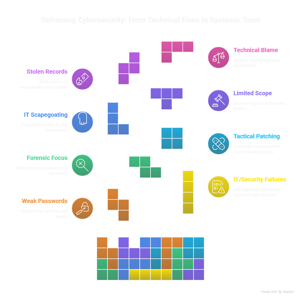 Most reporting has focused on this technical surface: the weak passwords that should have been stronger, the legacy RC4 ciphers that should have been disabled, the excessive privileges that should have been restricted. These details read like a cybersecurity checklist from 2015, familiar to anyone who has read breach reports over the past decade. However, treating these as causes is akin to blaming a building collapse on the specific beam that failed, while overlooking the absent foundation that made the collapse inevitable. Those technical failures are not causes; they are the visible symptoms of a deeper structural failure in how trust is manufactured, governed, and maintained as an enterprise asset.